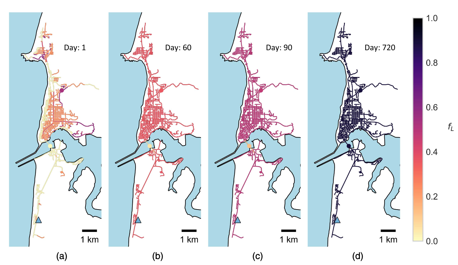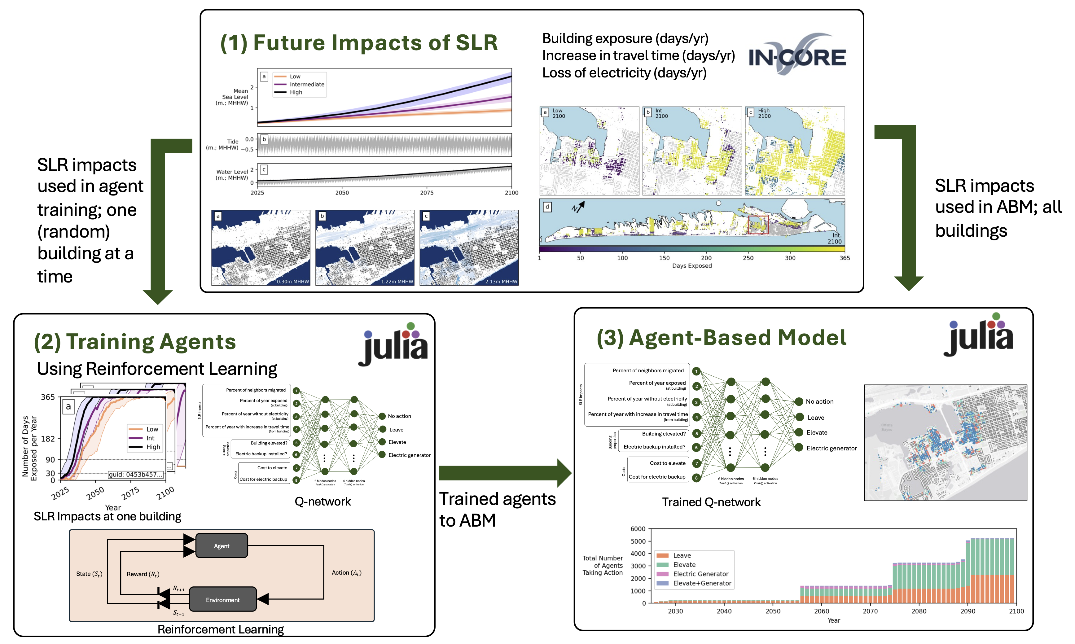 Summary:I completed this work during my time as a National Research Council Postdoctoral Fellow at NIST (2023-2025). The objective of this work was to develop decision-support tools to help communities become more resilient to chronic hazards that are associated with a changing climate. In particular, I focused on flooding due to sea level rise (SLR) and high tides, and considered the resulting impacts on buildings, electric power, and transportation networks. On top of this, I developed an agent-based model to simulate how households may respond to the future impacts of SLR. Reinforcement learning was used to characterize agent behavior. This allows agents to learn for themselves how to respond to changes in their envirnment.