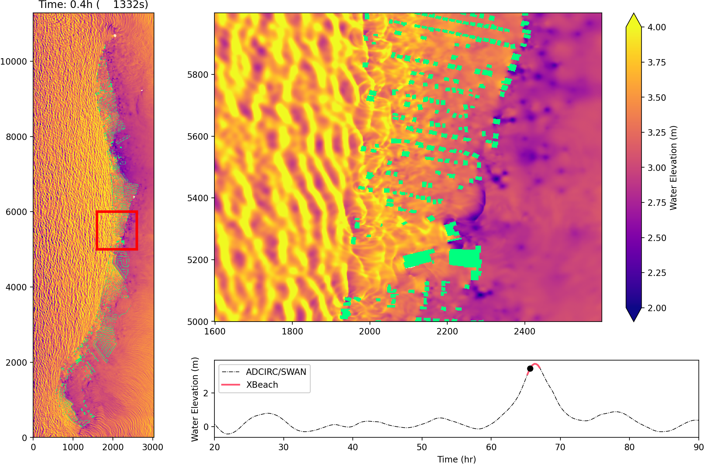 Summary:This is on-going work looking at modeling hurricane overland surge, waves, and currents through the built environment. Coastal models of hurricane storm surge typically neglect the built environment, or represent it through changes in bottom friction coefficients despite the importance of buildings in influencing overland waves and currents. For risk and catastrophe modlels, this can lead to inaccurate estimates of hurricane damage, translating to inaccurate estimates of economic losses. Preliminary results show that including buildings in numerical models of overland hazards significantly influence wave heights at individual structures. As expected, buildings near to the shoreline act to shelter subsequent rows of buildings. Interestingly, however, including buildings in the simulations also results in some buildings observing larger wave heights compared to scenarios in which no buildings are included in the model domain.